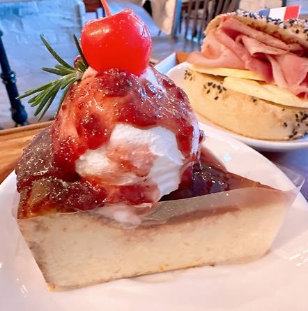 쇼케이스에 진열된 디저트 중에서 선택했는데, 위에 생크림과 잼이 올라가 있어서 달콤하면서도 꾸덕한 치즈케이크였어요. 입안에서 사르르 녹는 느낌이 좋았어요.