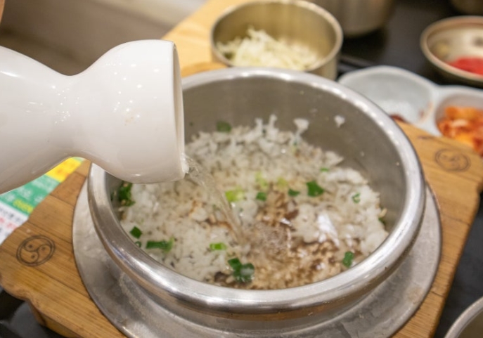 마지막으로 솥에 뜨거운 물을 부어 뚜껑을 닫아 두었더니, 식사를 마칠 때쯤 맛있는 누룽지가 완성되었습니다.