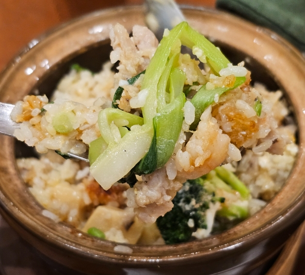 솥밥의 바닥 부분이 노릇하게 눌어붙어 있어 그냥 두면 먹기 어려웠습니다. 숟가락으로 눌어붙은 부분을 긁어가며 비벼 먹었더니 바삭한 누룽지와 야채, 새우, 돼지고기 완자가 어우러져 환상적인 식감과 맛을 자랑했습니다.