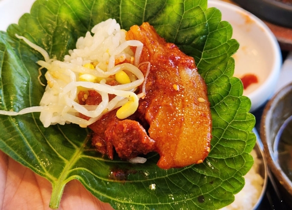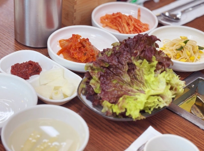 또한, 기본 반찬으로 제공되는 명이나물이 함께 나오는데, 새콤한 명이나물에 고기를 돌돌 말아 한입 먹으면 기름진 육즙과 상큼한 조화가 환상적인 맛을 선사합니다.