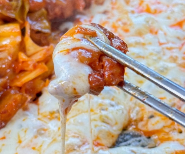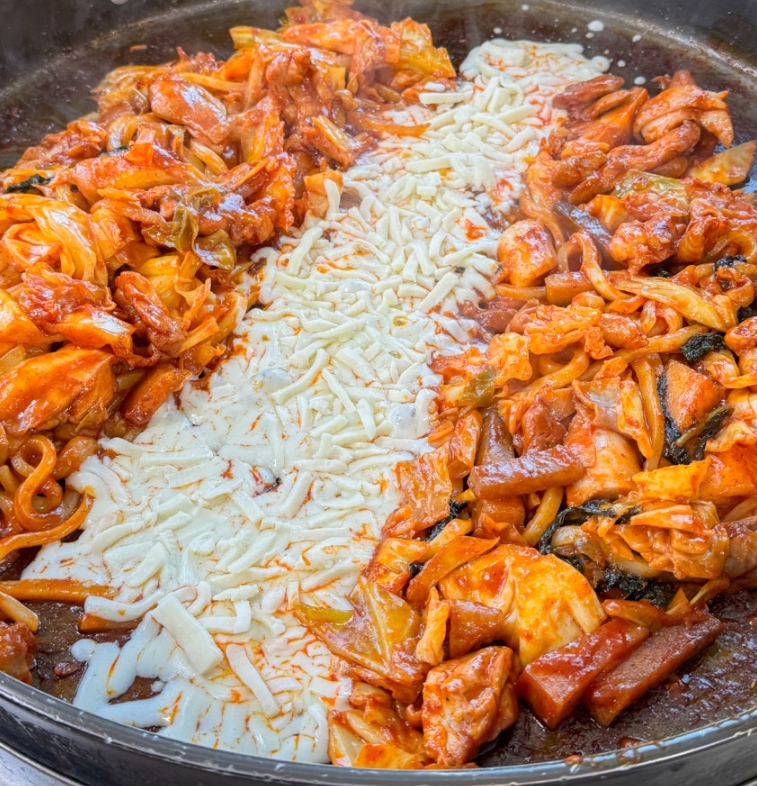 그런데 이 치즈가 닭갈비의 양념과 섞여서 더욱 고소하고 풍미가 깊어졌습니다.