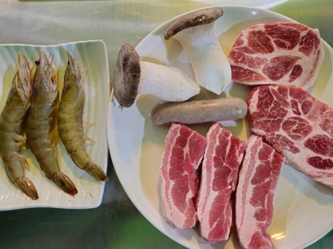 생목살, 삼겹살, 소시지, 새우, 버섯, 명이나물, 각종 야채까지 푸짐하게 제공