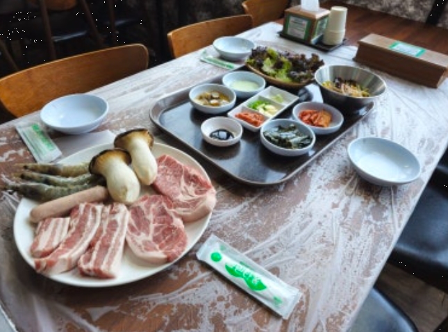 바베큐 세트를 주문하면 가장 먼저 숯불이 세팅되고, 이후 기본 반찬과 함께 고기와 해산물이 제공됩니다. 고기는 두툼한 두께를 자랑하며, 선홍빛의 신선한 색감이 돋보입니다.