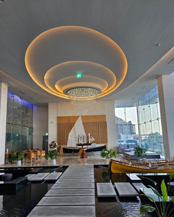 크루즈 컨셉에 맞춘 고급스러운 분위기가 느껴졌고, 로비 곳곳에는 바다를 조망할 수 있는 커다란 창이 있어 개방감이 뛰어났어요.