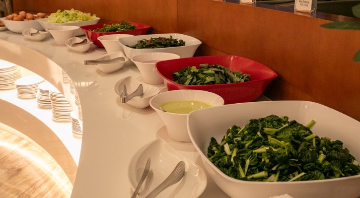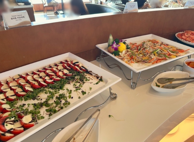 음식 종류는 기본적으로 잘 갖춰져 있었지만, 생각보다 메뉴가 많진 않았어요. 특히 한식 종류가 조금 부족한 느낌이었어요. 개인적으로 가장 맛있었던 메뉴는 연어와 새우 요리, 그리고 즉석에서 만들어주는 오믈렛이었어요.