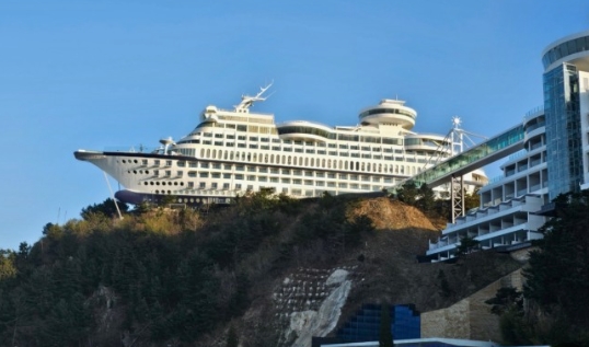 마치 바다 한가운데 떠 있는 대형 크루즈 선박이 육지로 올라와 있는 듯한 모습이었어요. 주변의 다른 건물들과는 확연히 다른 외관 덕분에, 단번에 이곳이 특별한 호텔이라는 걸 실감할 수 있었죠.
