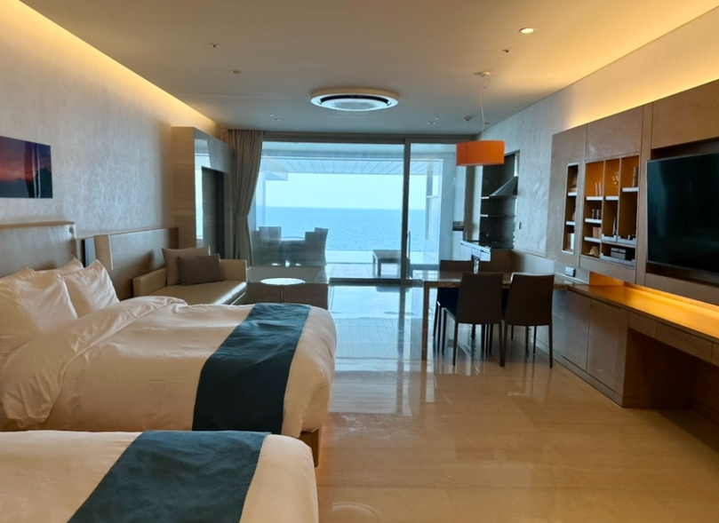 체크인을 마치고 객실로 들어가는 순간, 한마디로 ‘와’라는 감탄이 절로 나왔어요. 객실 문을 여는 순간 커다란 통유리창 너머로 보이는 바다 뷰가 한눈에 들어왔거든요.