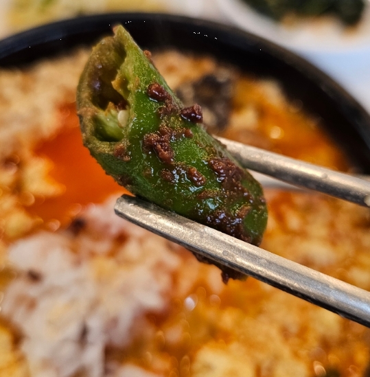 그리고 된장 양념으로 버무린 매운 고추가 정말 매콤해서 짬뽕순두부보다 몇 배는 더 매웠지만, 그 매운맛도 일품이었어요. 계속 먹게 되는 묘한 매력.