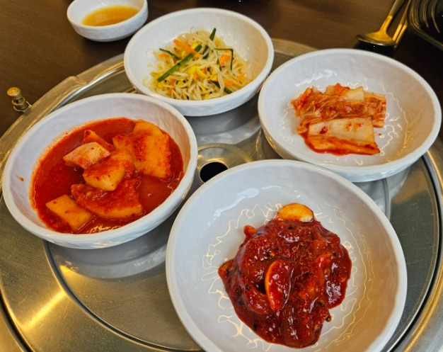 밑반찬으로는 깍두기, 배추김치, 콩나물무침, 오징어젓갈 등이 제공되며, 부족한 반찬은 셀프바에서 추가로 가져다 먹을 수 있어 편리합니다.