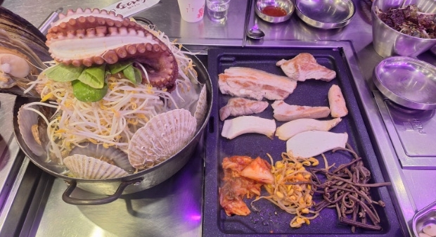 고기와 조개를 함께 구우니 더욱 푸짐하게 느껴졌고, 소스도 다양하게 제공되어 각자 입맛에 맞게 조리할 수 있어 좋았어요.