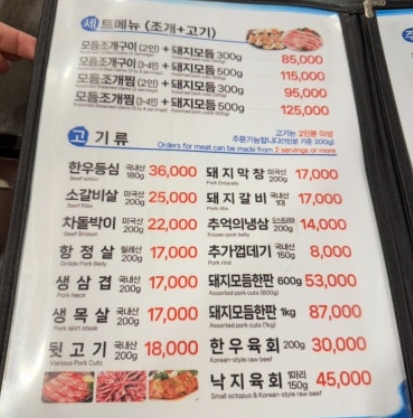 여기서는 고기, 회, 조개를 모두 즐길 수 있어 선택의 폭이 넓습니다. 메뉴판을 보니 가격도 합리적이고, 술도 원래 프리미엄이 붙는 경포대 주변의 다른 맛집들에 비해 부담이 적어서 좋았어요.