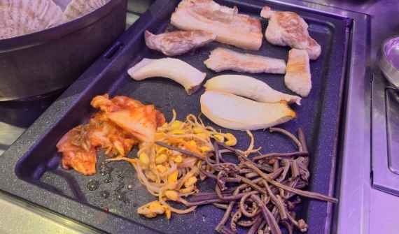 고기는 삼겹살을 오겹살로 구워 먹었는데, 껍데기가 있어 더 맛있었어요. 기름이 빠져 나오는 동안 김치, 콩나물, 고사리 등을 함께 구워 먹으니 더욱 맛있었습니다.