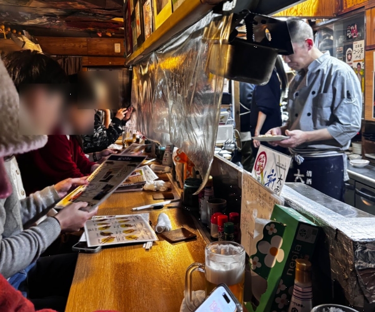 야키토리타케토리는 정말 아담한 가게예요. 다찌석(바 테이블) 중심의 구조라 한 번에 넉넉히 앉아야 9명 정도 수용 가능한 작은 공간입니다.