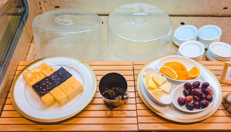 카이센동을 먹고 난 후에는 셀프바에서 과일과 미니 케이크를 즐길 수 있어요. 커피도 제공되기 때문에, 식사를 마친 후에 디저트와 커피로 마무리할 수 있었어요. 하이볼도 취향에 맞게 즐길 수 있어 완벽한 한 끼였습니다.