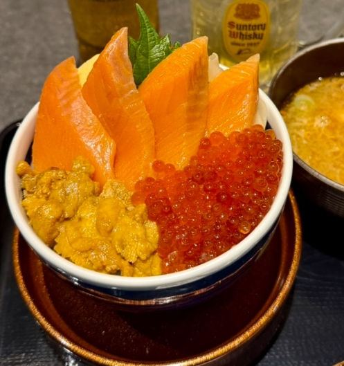 카이센동의 우니는 입에 넣자마자 바다 향이 진하게 퍼지면서 부드럽고 맛있었어요. 연어알은 예상과 달리 비린맛이 전혀 없고, 톡톡 터지는 식감이 너무 좋았어요. 우니와 연어알을 함께 먹으면 정말 화룡정점이에요.