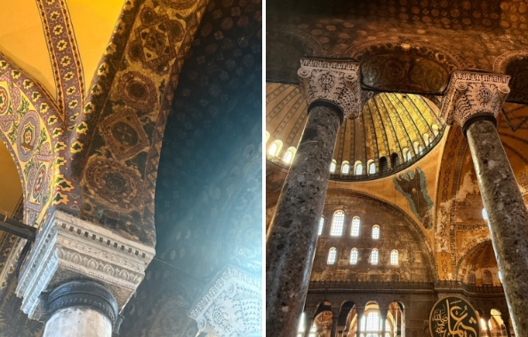 한쪽 벽면에서는 아랍어로 된 문양이 장식되어 있고, 반대편에서는 성경 속 인물들이 묘사된 벽화를 볼 수 있었어요. 이런 점에서 아야소피아는 종교와 문화가 융합된 건축물이라는 것을 실감하게 해주었어요.