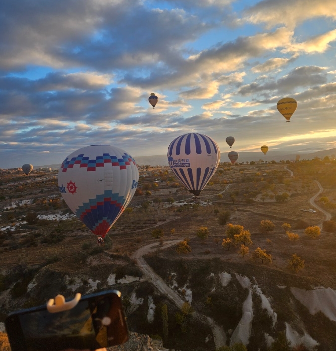 드디어 하늘 위로 떠오르며 괴뢰메 지역의 독특한 지형과 일출을 감상할 수 있었어요. 하늘을 둥둥 떠다니는 기분은 말로 표현할 수 없을 만큼 신비로웠습니다.