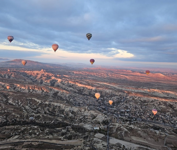 드디어 하늘 위로 떠오르며 괴뢰메 지역의 독특한 지형과 일출을 감상할 수 있었어요. 하늘을 둥둥 떠다니는 기분은 말로 표현할 수 없을 만큼 신비로웠습니다.