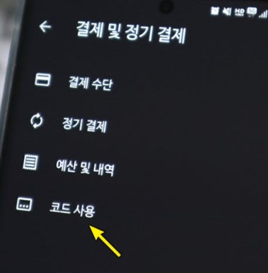 화면 하단에 있는 '코드 사용' 옵션을 선택합니다.