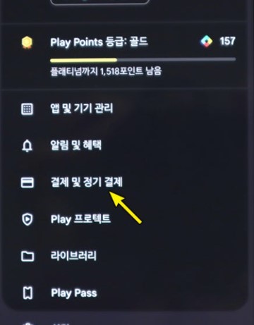 프로필 메뉴에서 '결제 및 정기 결제' 옵션을 선택합니다.