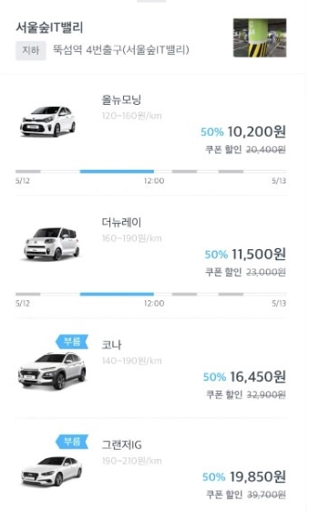 저는 집 근처 쏘카존에서 모닝 경차를 예약하였습니다.