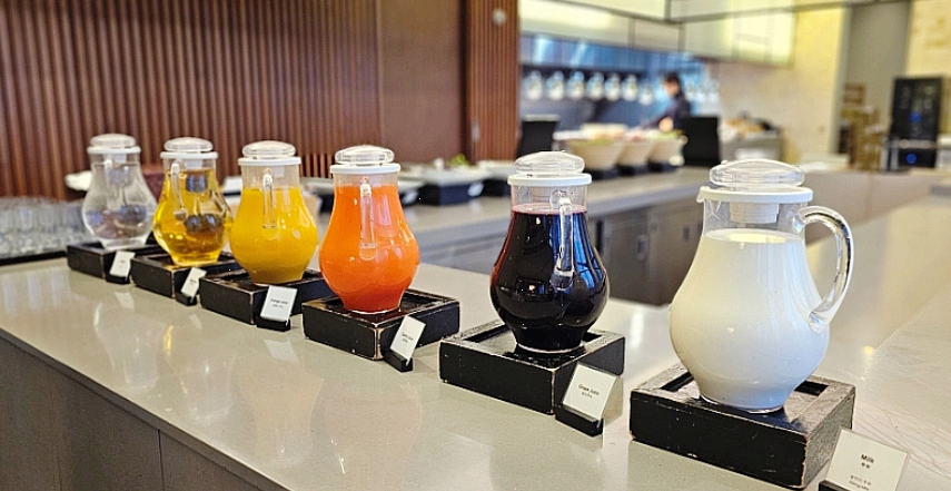 음료 코너에서 가장 눈에 띄었던 것은 블루베리 바나나 주스였습니다. 많은 호텔 조식을 이용해봤지만, 이 주스는 처음 접하는 메뉴였습니다. 한 잔 따라 마셔보니 달콤하면서도 상큼한 맛이 조화를 이루어 만족스러웠습니다.