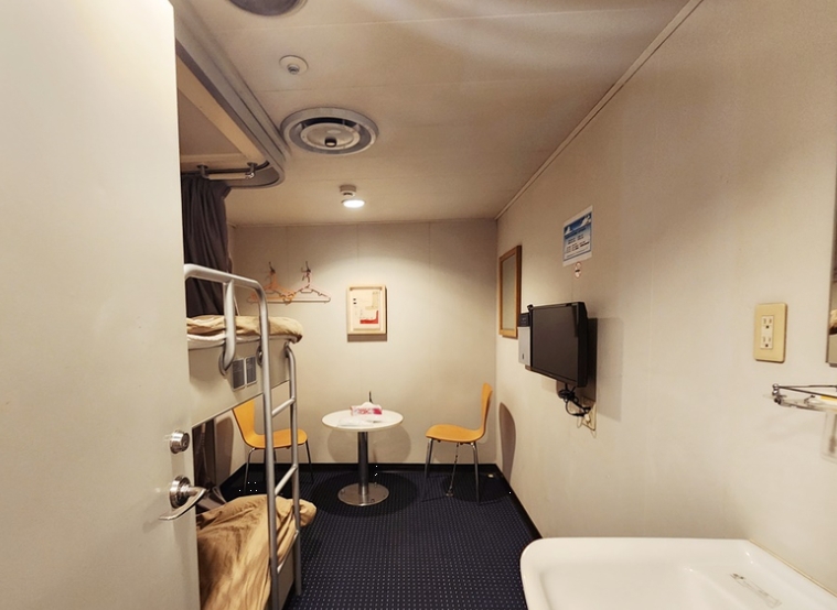제가 선택한 객실은 1등실(2인실)로 내부는 2층 침대 구조에 테이블, TV, 세면대까지 갖춰져 있었습니다. 침대마다 개인 커튼이 있어 프라이버시가 보장되었고, 침대 커버, 이불, 치약, 칫솔, 수건까지 제공되어 따로 준비할 필요가 없었어요.