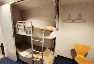 제가 선택한 객실은 1등실(2인실)로 내부는 2층 침대 구조에 테이블, TV, 세면대까지 갖춰져 있었습니다.  침대마다 개인 커튼이 있어 프라이버시가 보장되었고, 침대 커버, 이불, 치약, 칫솔, 수건까지 제공되어 따로 준비할 필요가 없었어요.