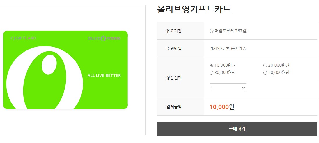 원하는 금액의 올리브영 기프트카드를 구입 후 사용하시면 됩니다.