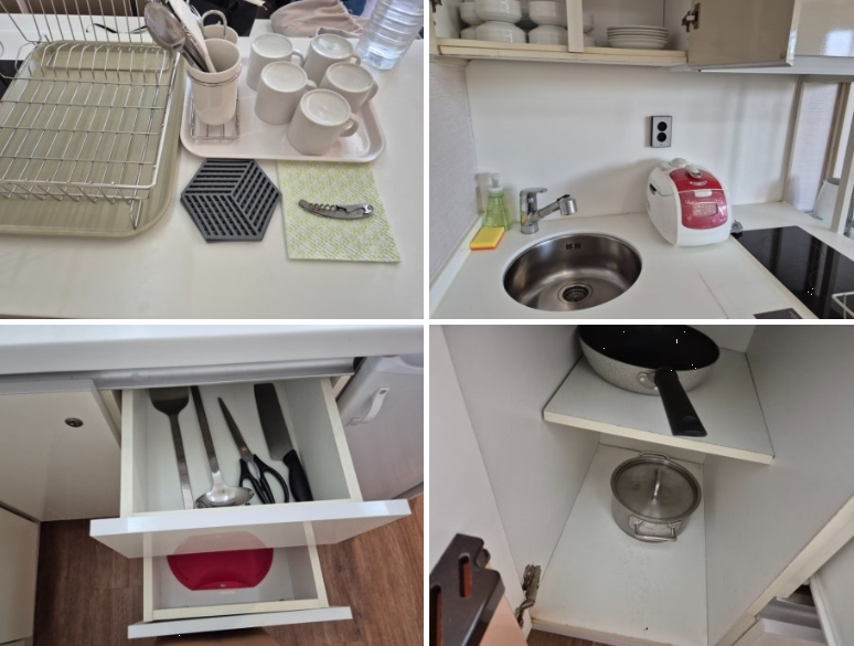 특히, 부엌이 있어서 간단한 요리를 해 먹을 수 있었던 점이 좋았습니다. 전자레인지는 없었지만, 인덕션과 소형 냉장고, 밥솥이 있어 간편하게 조리를 할 수 있었어요.