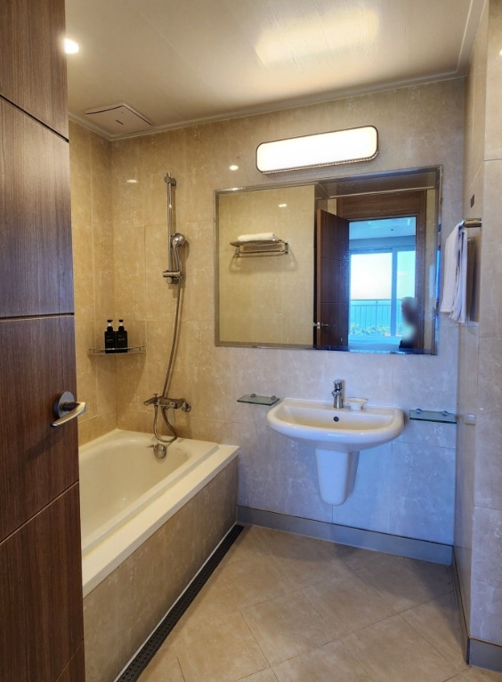 또한, 화장실이 두 개라서 아침에 씻을 때도 불편함이 없었습니다. 침대방에는 욕조가 있어서 여행의 피로를 풀기에도 좋았어요. 개인적으로 여행을 다니면서 호텔에서 욕조가 있는 곳을 선호하는데, 소노캄 제주는 이 점에서도 만족스러웠습니다.