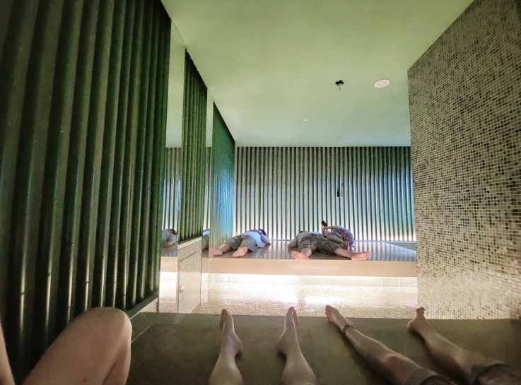 고대 이집트 피라미드 내부를 연상시키는 독특한 인테리어가 인상적이었습니다. 이곳은 열이 골고루 퍼져 있어 따뜻하게 몸을 감싸는 느낌이었고, 편안하게 누워 명상을 하기에 좋은 공간이었어요.