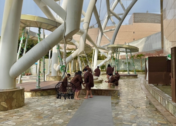 찜질방을 충분히 즐긴 후, 실외에 마련된 족욕장으로 이동했습니다. 스파랜드의 족욕장은 자연광이 가득 들어오는 구조로 되어 있어, 따뜻한 물에 발을 담그고 하늘을 바라보며 여유로운 시간을 보낼 수 있었어요.