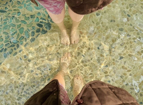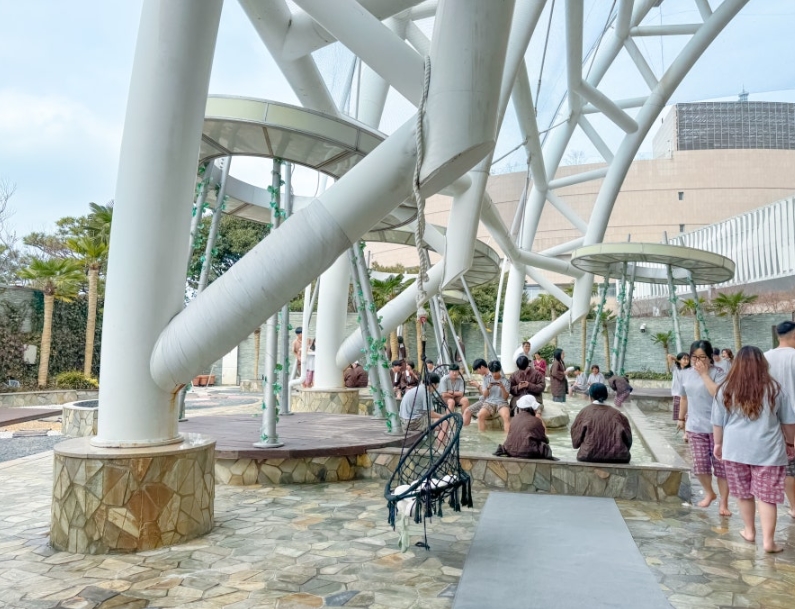 찜질방을 충분히 즐긴 후, 실외에 마련된 족욕장으로 이동했습니다. 스파랜드의 족욕장은 자연광이 가득 들어오는 구조로 되어 있어, 따뜻한 물에 발을 담그고 하늘을 바라보며 여유로운 시간을 보낼 수 있었어요.