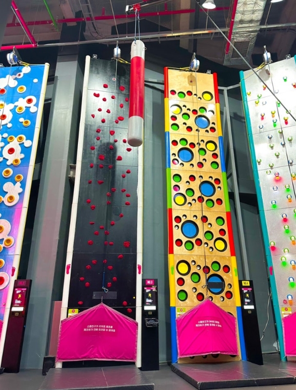 클라이밍은 직원들의 안내에 따라 안전 장비를 착용하고 진행하는데, 높이가 꽤 있어서 도전 정신이 필요했어요. 쉬운 코스부터 어려운 코스까지 단계별로 있어서 초보자도 부담 없이 도전할 수 있어요.