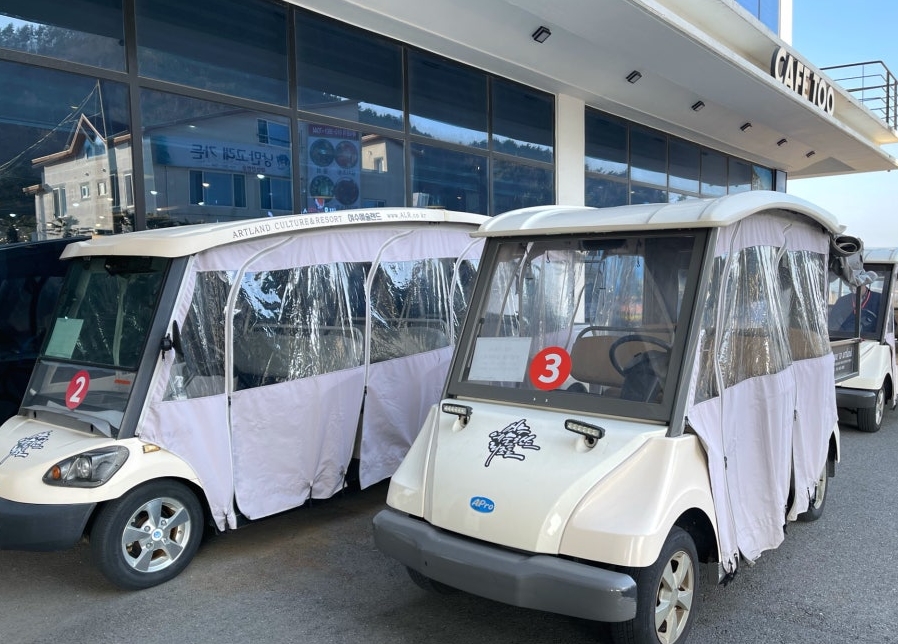 저는 리조트에서 제공하는 카트를 이용했는데, 이동하는 동안 여수 바다와 섬들이 보이는 풍경이 너무 아름다워서 짧지만 잊지 못할 순간이 되었습니다.