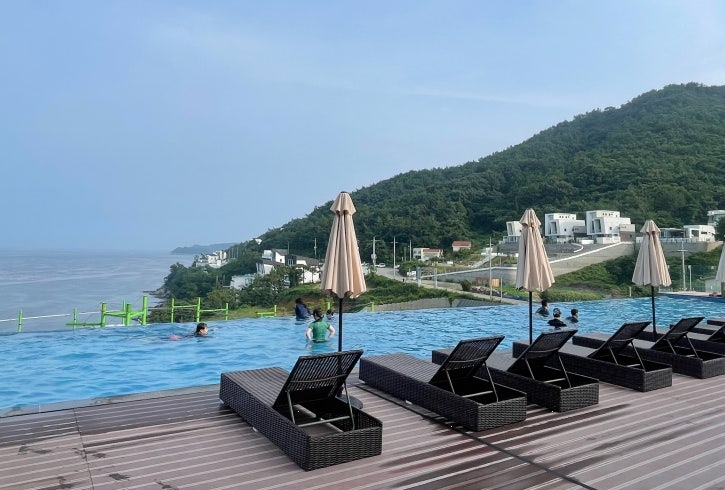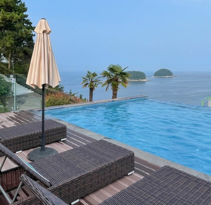 여수예술랜드 리조트에서 가장 기대했던 곳 중 하나가 바로 인피니티 풀이었습니다. 수영장은 바다와 맞닿아 있는 듯한 느낌을 주도록 설계되어 개방감이 뛰어났습니다. 특히, 노을이 질 때 수영장에서 바라본 풍경은 그야말로 환상적이었습니다.