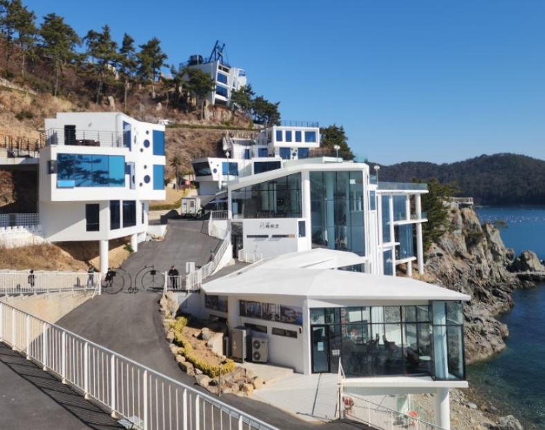여수예술랜드 리조트에 도착하자마자 눈앞에 펼쳐진 광활한 바다가 여행의 피로를 단번에 잊게 해주었습니다. 리조트는 해안가 절벽 위에 자리 잡고 있어 마치 바다 위에 떠 있는 듯한 느낌을 주었습니다. 주차 공간은 본관 앞 지상 주차장과 별도로 마련된 주차 타워 두 곳이 있어 편리하게 이용할 수 있었습니다.