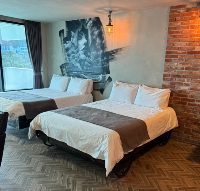 침대는 더블베드 2개였는데, 성인과 아이들이 사용하기에 충분한 크기였습니다. 다만, 침대 높이가 다소 높아서 아이들과 함께 이용할 경우 주의가 필요할 것 같았습니다.