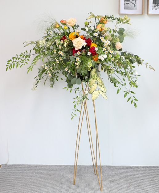 장미, 백합, 국화 등 다양한 꽃이 층층이 배치된 3단 화환은 크기와 화려함이 돋보이는 스타일입니다. 특히 규모가 큰 웨딩홀이나 공식적인 결혼식장에서 많이 사용되며, 웅장한 분위기를 연출하는 데 탁월합니다.