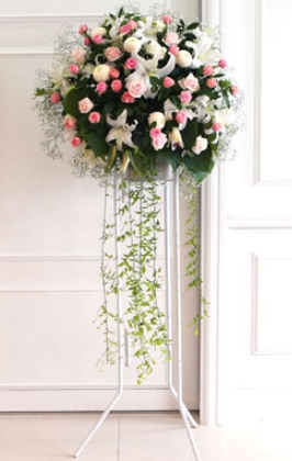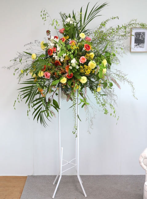 화사한 화분 디자인의 클래식 화환은 오랜 시간 사랑받아온 전통적인 스타일입니다. 화사한 장미와 백합을 중심으로 제작되며, 어떤 웨딩 스타일에도 무난하게 잘 어울립니다.