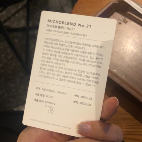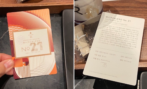 사용된 원두는 마이크로블렌드 No.21으로, 라틴아메리카와 동아프리카산 원두를 블렌딩한 고급 원두예요. 달콤한 시트러스 계열의 산미와 쌉싸름한 다크초콜릿의 풍미가 복합적으로 느껴지는 독특한 커피죠.
