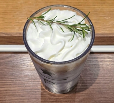 처음 음료를 받았을 때 가장 먼저 눈에 띈 건 은은한 보랏빛 시럽과 휘핑 크림, 그리고 그 위에 얹힌 로즈마리 한 줄기였어요. 정말 눈도 즐겁고 마음도 편안해지는 비주얼이더라고요. 시럽과 커피가 잘 섞이면 라벤더 특유의 허브향과 커피의 쌉싸름함이 어우러져 부드럽고 향기로운 맛이 완성돼요.