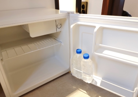 생수 두 병이 담긴 미니 냉장고도 구비되어 있어 목이 마를 때마다 꺼내 마실 수 있어 무척 편리했습니다. 작지만 알찬 공간 구성이 참 좋았어요.