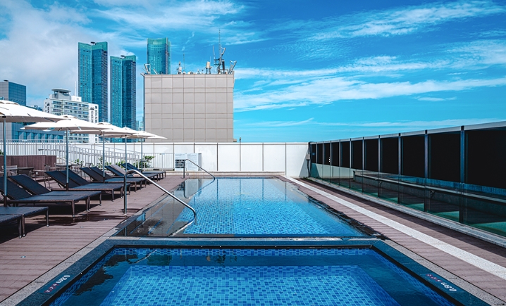 루프탑 수영장은 체크인 시 선착순 예약제로 운영되며, 1회만 이용 가능한 점은 아쉬웠지만, 바다를 배경으로 수영을 즐길 수 있는 이색적인 경험을 제공해줍니다.
