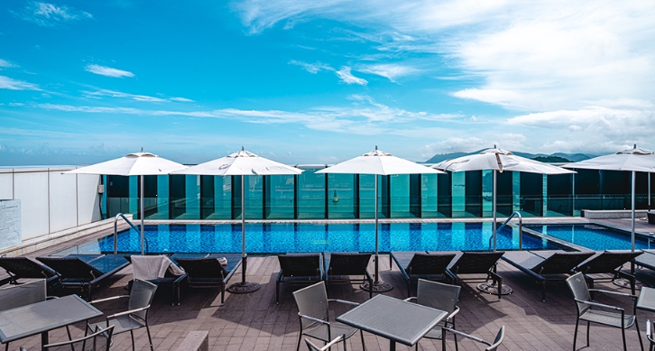 루프탑 수영장은 체크인 시 선착순 예약제로 운영되며, 1회만 이용 가능한 점은 아쉬웠지만, 바다를 배경으로 수영을 즐길 수 있는 이색적인 경험을 제공해줍니다.
