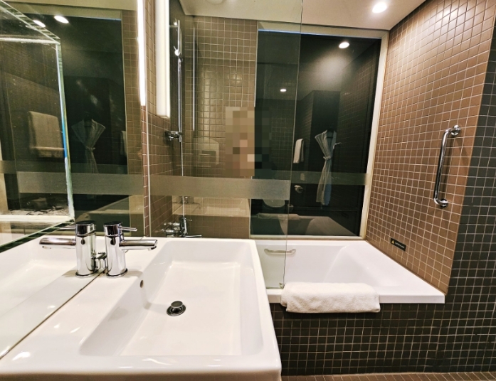 욕조 옆에는 창문이 있어, 반신욕을 하며 오션뷰를 감상할 수 있었는데, 이 점이 정말 특별하게 느껴졌습니다. 어메니티는 모두 다회용으로 제공되었고, 샴푸, 린스, 바디워시, 바디로션까지 깔끔하게 구비되어 있었습니다.
