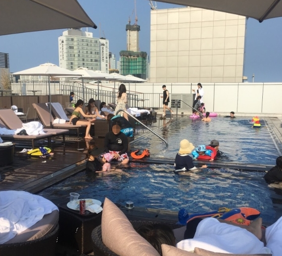 신라스테이 해운대에 머무르며 가장 기대했던 시설 중 하나가 바로 루프탑 수영장이었어요. 체크인하면서 수영장 이용은 투숙 기간 중 1회만 가능하다는 안내를 받았고, 원하는 시간대를 선택해 예약해야 했습니다.