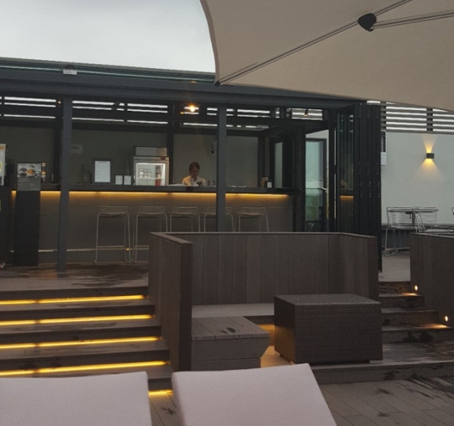 루프탑 바에서 간단한 음식이나 음료도 주문할 수 있었지만, 뷰에 대한 기대는 조금 아쉬웠어요. 유리 벽 너머로 해운대 바다가 보이긴 했지만, 개방감은 살짝 떨어지는 느낌이었거든요. 그래도 밤에는 조명이 들어와 분위기가 꽤 좋았고, 따뜻한 사우나 공간도 있어 물놀이 후 몸을 녹이기에 좋았습니다.