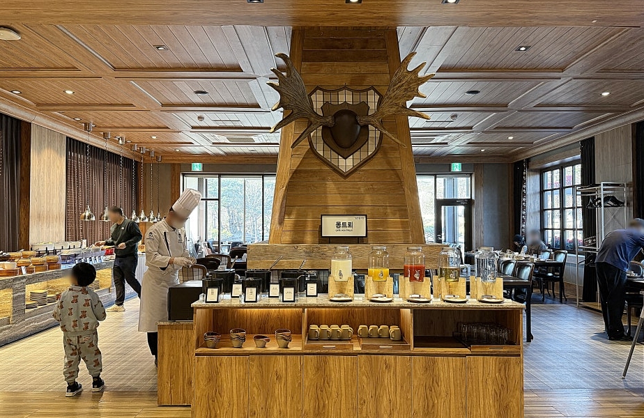 다음 날 아침은 리조트 조식 뷔페를 이용했어요. 애견동반 객실 투숙객은 반려견을 객실에 두고 다녀와야 하지만, 식사 공간과 메뉴 구성 자체는 호텔 수준으로 깔끔하고 다양했어요.